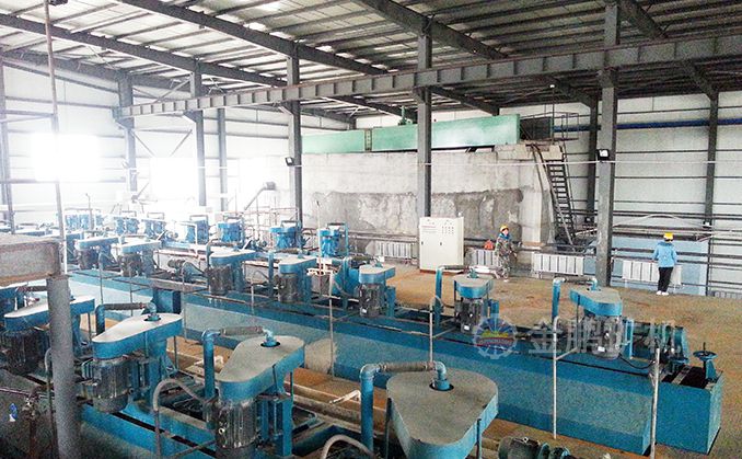 本工藝采用兩段一閉路破碎流程,合格產(chǎn)品進(jìn)入粉礦倉(cāng)緩存,礦石由擺式給礦機(jī)均勻的給到直筒節(jié)能格子型球磨機(jī)進(jìn)行磨礦,格子球磨機(jī)和高堰式單螺旋分級(jí)組成一段閉路磨礦分級(jí)流程。球磨機(jī)的排礦先經(jīng)過(guò)跳汰機(jī)富集大顆粒金,跳汰機(jī)底流通過(guò)兩段搖床選出30%品位的顆粒金,跳汰機(jī)的溢流進(jìn)入分級(jí)機(jī)。分級(jí)溢流經(jīng)過(guò)攪拌槽的調(diào)漿后進(jìn)入浮選系統(tǒng),通過(guò)做礦石的可選性實(shí)驗(yàn)研究我們選擇一粗三精三掃的浮選流程,從而很大程度的回收脈石中的有價(jià)金元素。浮選金精礦通過(guò)濃密機(jī)濃縮由過(guò)濾機(jī)完成脫水作業(yè),浮選尾礦由濃密機(jī)濃縮后進(jìn)入壓濾機(jī)進(jìn)行壓濾成濾餅做到尾礦干排。金礦重浮聯(lián)合流程也是金鵬集團(tuán)用于山東黃金集團(tuán)蓬萊大柳行選廠項(xiàng)目中的成功經(jīng)驗(yàn)。