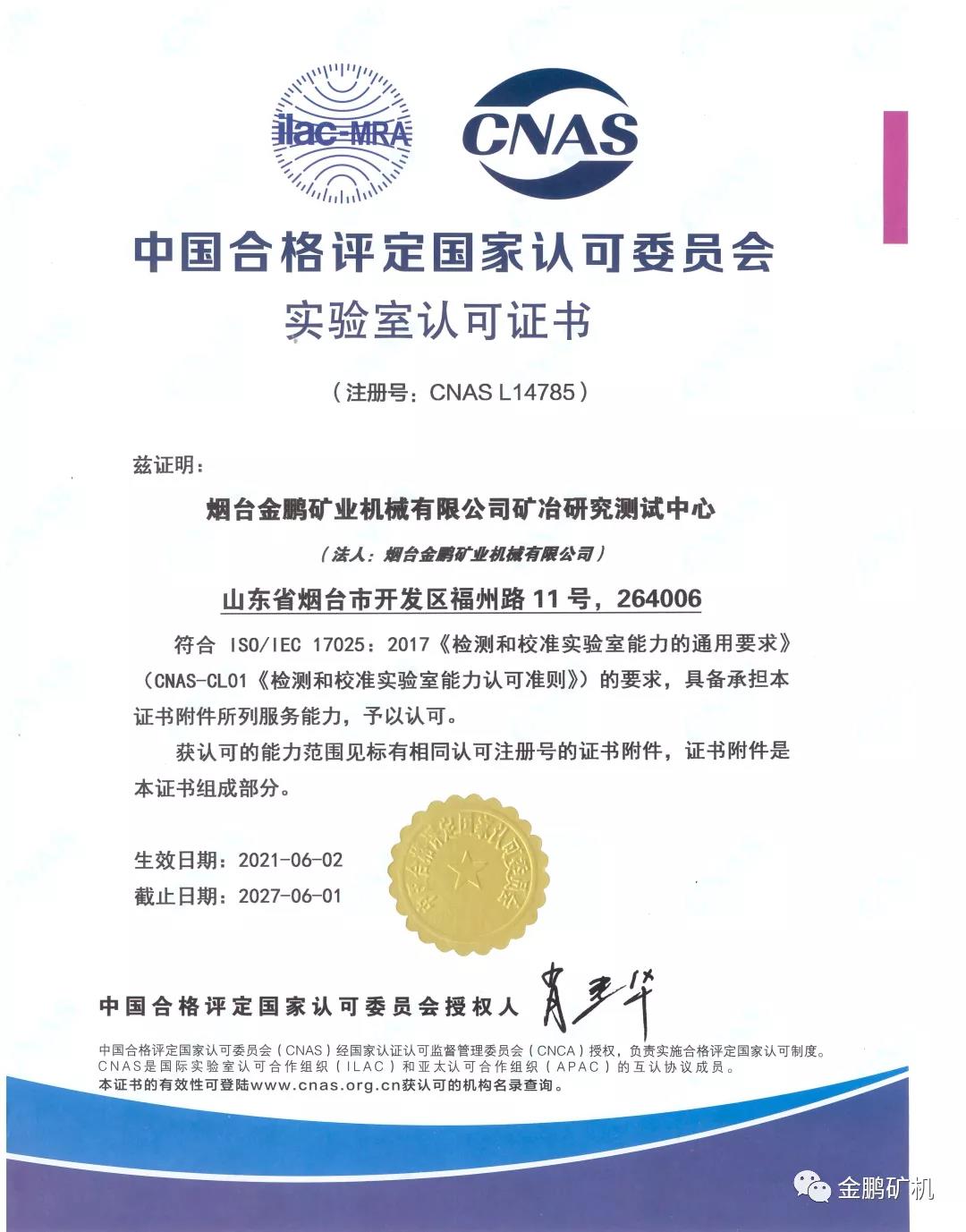 碩果源于奮斗 創(chuàng)新彰顯實力——熱烈祝賀金鵬礦機礦冶研究測試中心通過CNAS認證