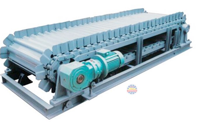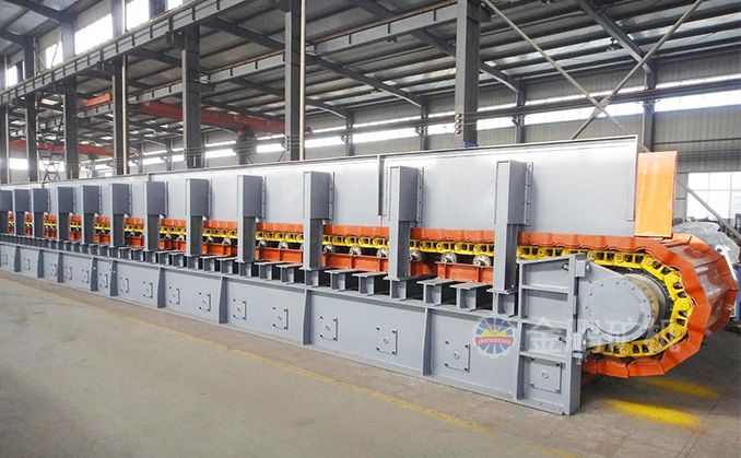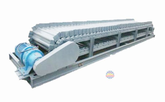 采用節(jié)距為150mm的高強(qiáng)度模鍛鏈條為牽引件,兩根鏈條繞過(guò)安裝在機(jī)體頭部的一對(duì)驅(qū)動(dòng)鏈輪和機(jī)體尾部的一對(duì)張緊輪聯(lián)成封閉形回路,在兩排鏈條的每個(gè)鏈節(jié)上裝配了相互交迭的、輕型結(jié)構(gòu)的輸送槽而成為一個(gè)連續(xù)的能夠運(yùn)載物料的輸送線路。其自重和物料的重量由安裝在機(jī)體上的多排支重輪、鏈托輪和滑道梁支承。傳動(dòng)系統(tǒng)經(jīng)交流變頻調(diào)速電動(dòng)機(jī)聯(lián)接減速機(jī),再由漲套與驅(qū)動(dòng)裝置直聯(lián)驅(qū)動(dòng)運(yùn)載機(jī)構(gòu)低速運(yùn)行。將尾部料倉(cāng)卸入的物料沿輸送線路運(yùn)至機(jī)體的前方排出,實(shí)現(xiàn)向下方的工作機(jī)械連續(xù)均勻喂料的目的。