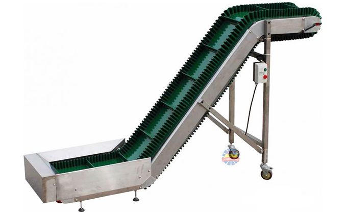 波狀擋邊輸送帶中以大傾角波狀擋邊輸送帶最有名,大傾角波狀擋邊輸送帶又叫裙邊隔板輸送帶,是由基帶、擋邊、橫隔板3部分組成。擋邊起防止物料測滑撒落的作用。為便于繞過滾筒,檔邊設計成波紋狀;橫隔板的作用是承托物料,為了實現大傾角輸送,采用T型TC型。檔邊和橫隔板是用二次硫化的方法與基帶連接的,具有很高的連接強度。